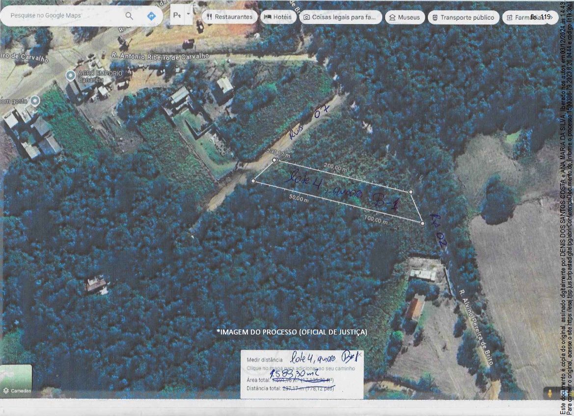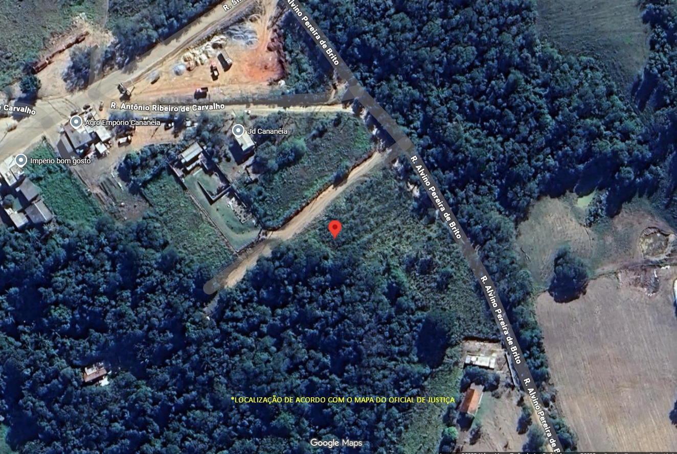 Matrícula nº 9.555 – CRI de Piedade/SP: Lote nº 04, da quadra B-1, do loteamento denominado “Jardim Cananéia”, situado nos bairros do Pinhal, Turvo do Pinhal, Turvo, Pinhal ou Boa Vista, Pinhal do Turvo, Turvo ou Pinhal, município de Pilar do Sul, desta Comarca, em virtude da Lei Municipal nº 601/84, de 20/9/1.984, passou a pertencer a Zona Urbana, para fins do disposto do artigo 3º da Lei nº 6.766, de 19/12/1.979, com a área de 1.589,30m², localizado com frente para a Rua 07, onde mede em reta 24,20 metros, fundos mede 25,89 metros, confrontando-se com a Rua 02, lado direito mede 94,50 metros, confrontando-se com lotes 3 e 6, lado esquerdo mede 64,43 metros, confrontando-se com o lote 05. Terreno baldio e metade do lote é coberto por denso capoeirão e há um declive acentuado na divisa com lotes 3 e 6 da mesma quadra.
